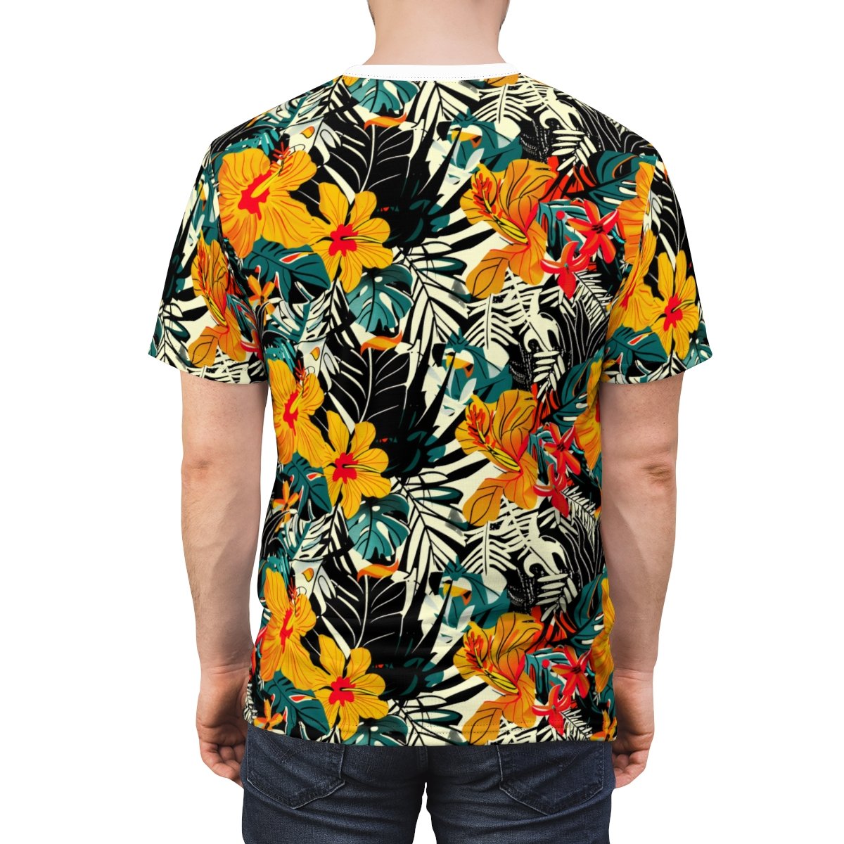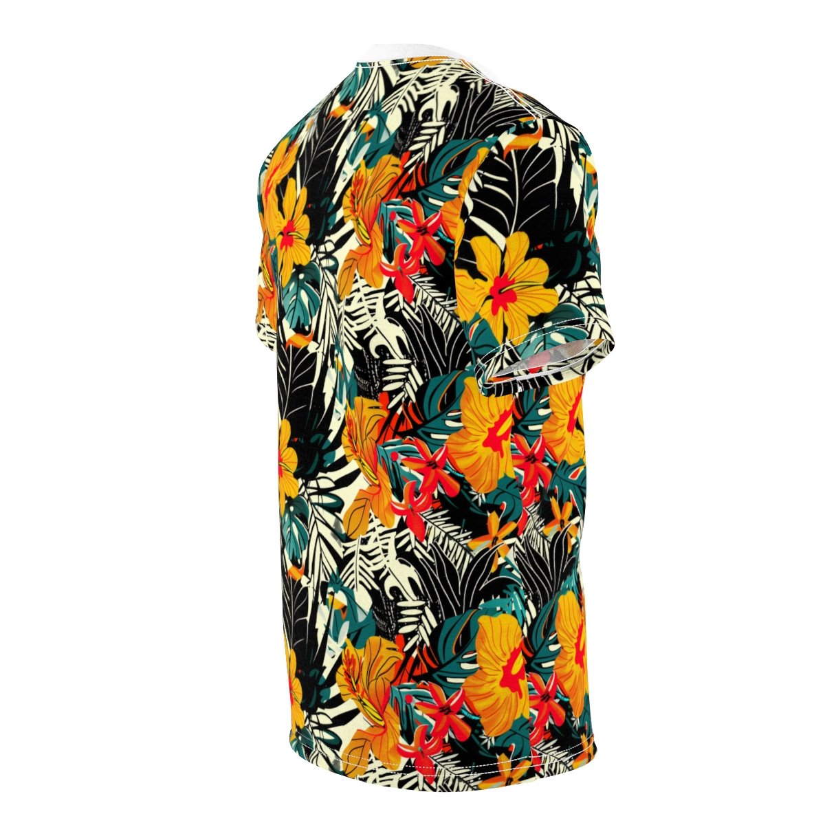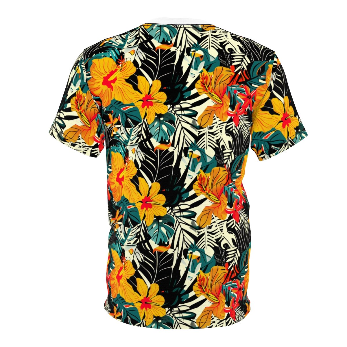 This piece is drenched in the lush imagery of the tropics, featuring bold hibiscus blooms, exotic foliage, and an energizing palette of warm yellows, vibrant oranges, and deep greens, all set against striking black and white geometric patterns. It’s a full immersion into a tropical aesthetic, transforming a simple tee into a statement piece that exudes a sense of endless summer.